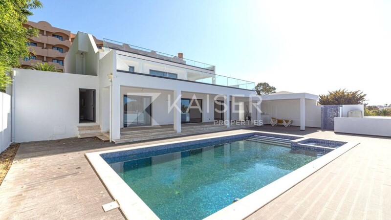 This spacious villa, with open sea views and located within walking distance to the beach, restaurants, shops and supermarket, is being completely refurbished to a high standard including a large south-facing swimming pool and garage with laundry room, offering great potential for investment.Albufeira old town and marina, with a variety of bars and restaurants, are located within a 10 min. drive, just like the nearest shopping centres, located outside the charming village of Guia and in Albufeira.Ground floor: hall; spacious living/dining area with patio doors leading out to the pool area; fully equipped kitchen; bedroom with patio doors; office room (currently used as a bedroom); 2 bathrooms en-suite; lavatory.First floor: 3 bedrooms, all with access to large semi-covered terrace with sea views and access to rooftop terrace; 3 bath/shower room (2 en-suite).Top floor: rooftop terrace with panoramic sea views. This property, completely walled, features a terrace with large swimming pool, shower, covered al-fresco area with BBQ.The villa also offers underfloor heating, solar pannels, AC in all bedrooms and living/dining area.
