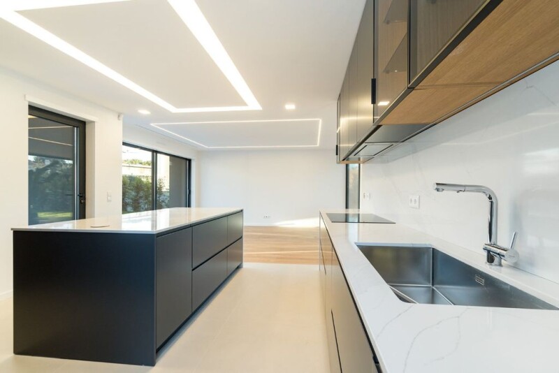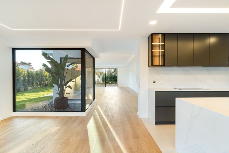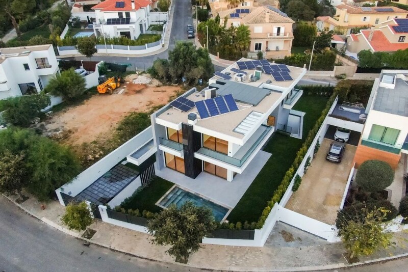 Excellent 4 Bedrooms +1 Detached Villa with modern architecture, located in a quiet residential area in Birre, Cascais. Spread over 3 floors, the property comprises, on the ground floor, an entrance hall, a spacious living room, dining room, a fantastic fully equipped American kitchen with an open space island, a bedroom/Office and a complete guest bathroom. This floor has access to excellent terraces and a beautiful garden with a swimming pool. On the upper floor are the master suite with walk-in closet, 2 suites with closet and a fourth suite. All rooms have access to terraces, The lower floor comprises a garage for 3 cars, wine cellar, toilet, a 22m2 room, another 24m2 room and technical and storage areas. Equipped with air conditioning, underfloor heating, solar panels and heat pump, photovoltaic panels, double-glazed windows, video surveillance and heated swimming pool. Virtual tour here.