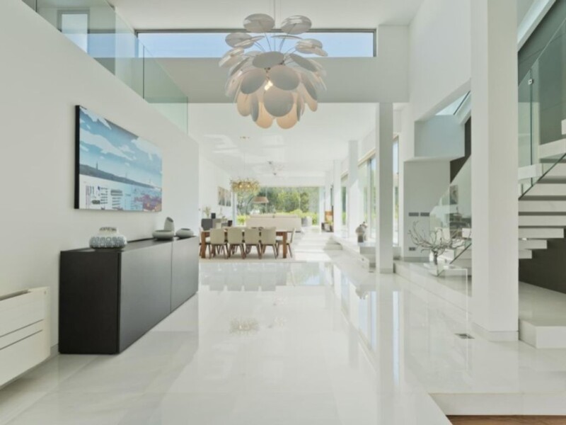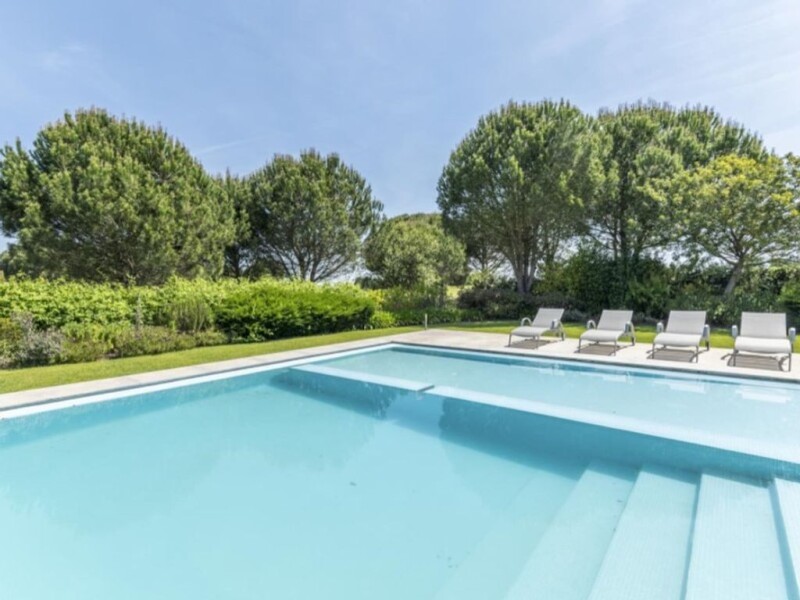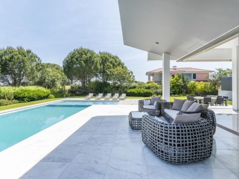 Detached 5-bedroom villa, with heated outdoor swimming pool, located in the private condominium Vila Nova de Santo Estevao, with views over the golf course. Implanted in a 2.000 sqm lot and with a 450 sqm constructed area, the villa also comprises an ample basement, whose area corresponds approximately to the building's implantation area (300 sqm). The villa is composed by two floors plus a basement, being distributed as follows: Ground floor: an entrance room with a double high ceiling (20,10 sqm) that accesses two other rooms, totaling an 81 sqm social area. The living room has a wood burning fireplace and provides a view to the swimming pool (47,80 sqm). Dining room (26.50 sqm) with direct access to the kitchen (22 sqm). Fully equipped kitchen with Miele and Electrolux household appliances, including a wine cellar, electrical and steam oven with a warming shelf, a 90 cm induction hob with 5 points, fridge and freezer, dishwasher, washing machine and tumble dryer. The kitchen countertop is in Corian as well as the coating of the pillars and the countertop. The kitchen´s cupboards are FABRI with a glazed front. The kitchen can be accessed from the outside. Close to the social area there is also a social bathroom with a mosaic panel Bisazza type. Completely separated from the social area, but still on the same floor, there is the private area that comprehends two suites (17 sqm) and a master suite (33 sqm), all with custom- made wardrobes with coplanar doors by FABRI. The access to the upper floor is made by the suspended staircase, also in mud marble from India. This floor is composed by a living area that can be used as an office, library, or other purposes, as well as two suites (16 sqm), both with access to an exterior balcony space. There is also a terrace which is accessible through the circulation corridor of the bedrooms. The materials used in this villa include Indian mud marble inside, Ibiza marble on the landings by the pool, granite in the kitchen and double glazed window frames, in Jofebar triple glazed rail with a 2 cm profile. The villa includes air conditioning and alarm. The waters are heated by solar panels and boiler. The swimming pool is heated by a heat pump and the garden has an automatic watering system through a borehole that also serves to fill the swimming pool, which results in a strong impact on the costs reduction. In the basement there is an electrical generator and the parking shed is equipped with charging for electric cars. Recently, photovoltaic panels were installed. KEY FEATURES -Highly regarded golf resort -Private gated entrance -Built to a very high standard -Very high specification throughout -5 bedrooms all on suits -Pool with heat pump -Separate heated kids pool -Energy and Water efficient - 3 Solar panels to heat water - 16 Photovoltaic panels + 4 batteries for electricity production - Waterborehole to supply water to garden and pool Located about 30 minutes away from Lisbon and 10 minutes away from Benavente, the development Vila Nova de Santo Estevao was designed to allow the enjoyment of Golf and activities and sports connected to nature. Designed, around the lagoon, for individual villas with large wooded lots, green areas and a low population density, offering unique conditions. The condominium has 24h/day security, an 18 holes golf course and several leisure facilities in a unique natural setting, ideal for those who intend living in a quiet and private place. Porta da Frente Christie's is a real estate agency that has been operating in the market for more than two decades. Its focus lays on the highest quality houses and developments, not only in the selling market, but also in the renting market. The company was elected by the prestigious brand Christie's - one of the most reputable auctioneers, Art institutions and Real Estate of the world - to be represented in Portugal, in the areas of Lisbon, Cascais, Oeiras, Sintra and Alentejo. The main purpose of Porta da Frente Christie's is to offer a top-notch service to our customers. Energy Rating: A.