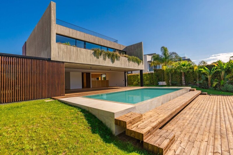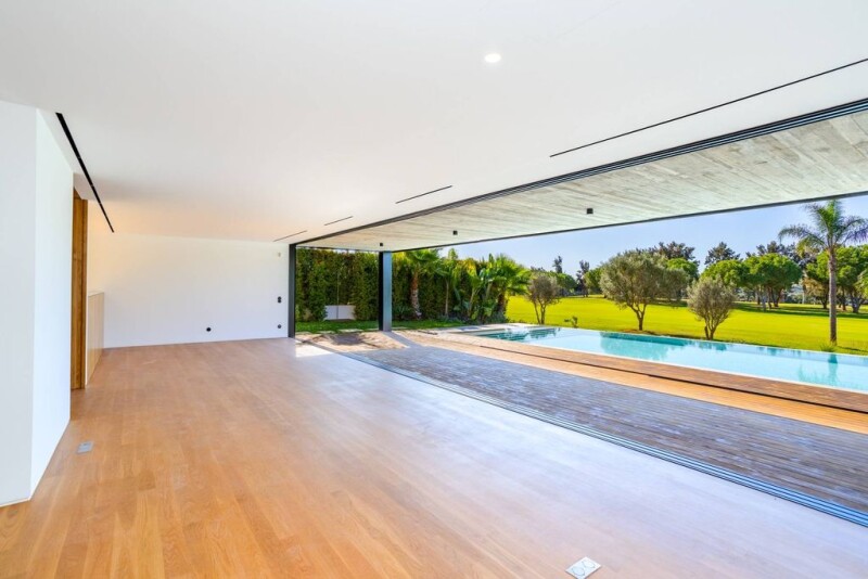 Stunning contemporary design villa where wood, glass, and concrete denote the balance between modernity and the environment. Located in a very quiet and central residential area of Vilamoura, just a few minutes from its Marina, the beach, all amenities, as well as leisure activities that give this area its international fame. This is a villa built according to high quality standards and completed this year 2024. This villa offers five bedrooms, all en suite, one of which is located on the ground floor and another in the basement. It also has a spacious and cozy living room with a fireplace, where large glazed windows retract, turning the indoor and outdoor space into a perfect symbiosis with stunning views over the golf course. This modern design was conceived to let in abundant light and allow direct access to the garden and pool, and a fully equipped modern and functional kitchen. The villa also has a large basement consisting of a gym space, a laundry room, and a garage for two cars and a cinema room. Its plot offers a magnificent view over a mature garden fully facing the golf course, with a swimming pool, and an inviting outdoor leisure area. Enjoy a unique lifestyle in a house where privacy, refinement, and comfort are above any comparison and with superb views over the golf course.