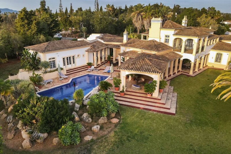 Located in Alcalar, known for the Megalithic archaeological heritage in the Mexilhoeira Grande parish in the municipality of Portimão, this imposing Mediterranean-style villa with five bedrooms stands out upon arrival for its beautiful facades and arcades of traditional design. It also features suspended pagoda roofs in Santa Catarina traditional tiles, which are thermally and acoustically insulated with typical Algarve lining made out of beams of wood. Located in a piece of land with 4870 square meters with automatic irrigation, facing north, east, south, and west, with 471 square meters of gross private area, the entrance of this property identifies its rustic character by the use of handmade terracotta tiles from Santa Catarina on the floor, leading us to the double height entrance hall with stairs leading to the first floor where we can find a library, a living room, an office, with access to a covered terrace and a master bedroom with two terraces, which are also covered. In the lower floor, there is a guest reception room leading to the private areas with three en-suite bedrooms, one of them with a fireplace and a living room, another one with a bath and a wooden mezzanine, the third one with a living room, a bath with whirlpool and shower, with built-in closets and all with independent access to the garden, as well as an area of laundry with cabinets and built-in sink. In the living room, there is a social bathroom and an adjoining dining room, leading to the outdoor covered terraces and living areas, and to another more private living room with fireplace and leading to a fully equipped kitchen, a storage room, and the closed garages. From this last room, we can exit to a leisure area with a barbecue and a pool, leading to a room with a jacuzzi, a sauna, a gymnasium, and another en-suite bedroom. The villa has underfloor heating, gas storage, and split air-conditioning, and was built according to the most demanding German construction standards, both thermally and acoustically, providing comfort and full living throughout the year, making it the perfect choice for those who prefer the countryside, without being too far away. It is located seven minutes from the Penina golf course, 15 minutes from the city of Portimão and the beaches, and 47 minutes from the Faro airport.