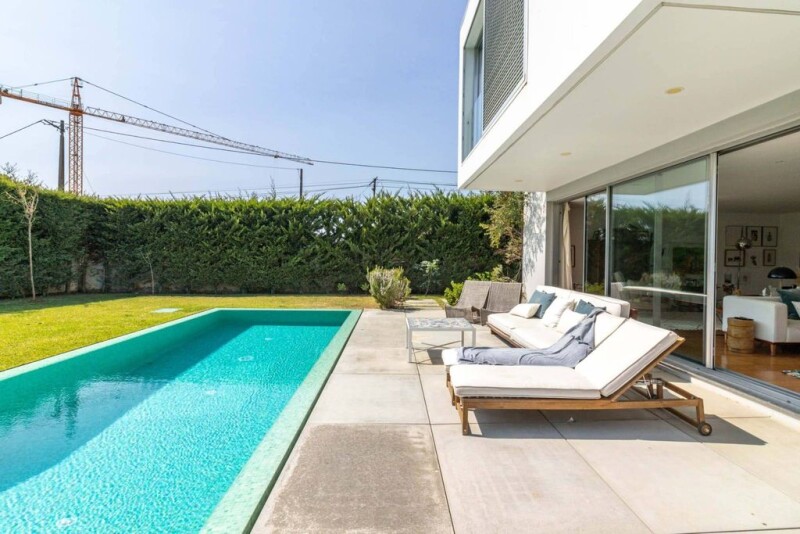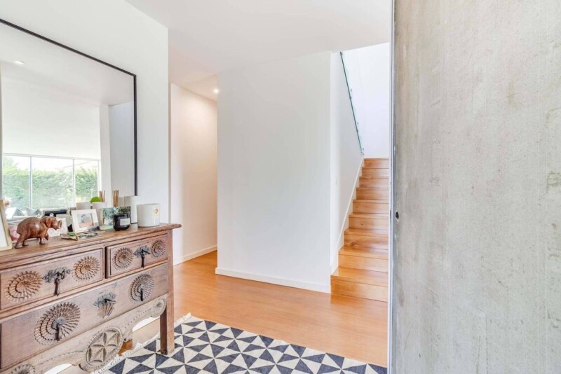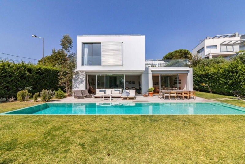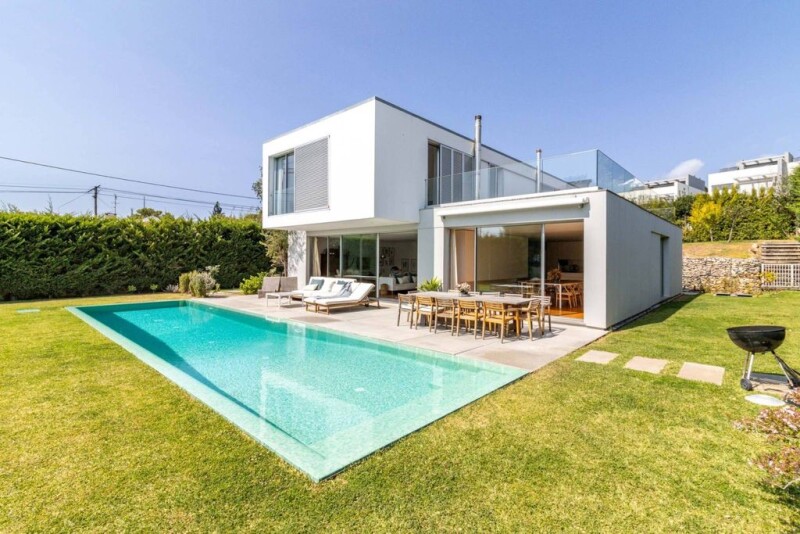 It is organized as follows: Floor 0: Entry Living room Dining room and kitchen Social bathroom Laundry Pantry Storage Garden Overflow pool Covered garage for 2 cars Floor 1: 4 Suites 2 Balconies Garden Collection Parking space for 2 cars. This villa was built in 2013 and is in good condition. It is a villa of contemporary architecture, and is integrated into the land, dividing it into 2 floors, the ground floor, more exposed - living and dining room facing a garden with swimming pool - to the south, with lots of light and protected from the wind coming from the north; and the 1st floor, with a more private character, where there is 1 master bedroom, also facing south (overlooking the garden and pool) and another 3 suites, facing east and a garden with a more private character, where some fruit trees are planted. Energy behavior/efficiency: It has a borehole, with a water tank, which is used for watering the garden and the pool. (all overseas) Central heating that runs on gas or electricity. It has 2 solar panels, which heat the water of the Caldeira, and between the months of May and October, they are self-sufficient, not requiring the use of gas to heat the water. Finishes: Solid Tauari wood floors Koklatt Kitchen Household appliances from AEG and BOSCH Gas hob with integrated extractor hood Corian Countertops Microcement bathroom floors Brushed aluminum windows, from Sosoares Surrounding area: This House is located in a residential area, characterized as a low-density area - residential. There are 2 international schools. A small center, where you can find restaurants, butcher and grocery stores/fruit shops. The A5 is 5/10' away, as well as Cascais Hospital and Cascaishopping. The center of Cascais and beaches are a 10' drive away, as well as the beaches in the center of Cascais, or Guincho. Transport 5/7' walk.
