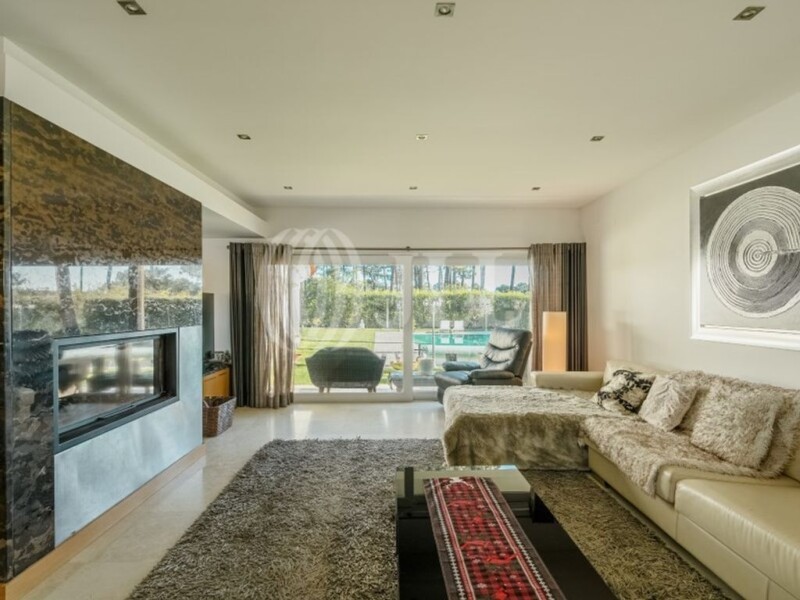 4+1 bedroom villa with 564 sqm of gross construction area, swimming pool, garden, terraces, and two garage spaces, set on a 1709 sqm plot in Herdade da Aroeira, Almada. The modern architecture villa, built in 2009 and in excellent condition, is spread over three floors. The -1 floor, with 180 sqm, includes a garage for two cars, three interior storage rooms, and a 66 sqm storage area with a window and bathroom. The ground floor, with 209 sqm, consists of a spacious entrance hall, living room with fireplace and windows on two fronts, fully equipped kitchen with island, pantry, and kitchenette with direct access to a porch equipped with a barbecue area, a suite, an office/bedroom, and a full bathroom. On the 1st floor, with 132 sqm, there are two large suites with dressing rooms and balconies. The villa has a water borehole. Herdade da Aroeira covers about 350 ha, has a gatehouse and security, two PGA golf courses, three tennis courts, a padel court, tropical swimming pool, a 4-star hotel, and a small commercial area. Located 5 minutes driving distance from Fonte da Telha beach, 25 minutes from Lisbon city center, and 30 minutes from Lisbon Airport. Energy Rating: B-.