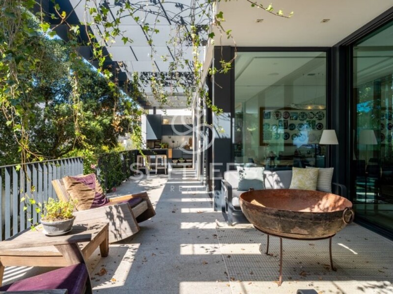Isolated Contemporary Architecture 4+2 Bedrooms House, with over 590 m2 of construction area, located in a prime area of Cascais, in Bicuda. Set on a plot of land with 1,392 m2, it is distributed over 3 floors as follows: Ground floor: Entrance hall (21.60 m2), which divides the leisure area from the private area, living room (71.08 m2) with 3 distinct environments, double-height ceiling, and direct access to a terrace (116.52 m2) with a heated pool with automatic cover, jacuzzi, barbecue with supporting kitchen and covered dining area, kitchen (23.12 m2) equipped with SMEG appliances and island with exhaust, guest WC, bedroom hall with storage space, master suite (36.05 m2) with walk-in closet and bathroom with bathtub and shower base, and 3 suites (23 m2 each) with wardrobes and bathrooms with shower bases. All bedrooms are south-facing and allow direct access to the outside. Upper floor: Open space with office (16.90 m2) and library (10 m2) with terrace (59.50 m2) facing south, providing natural light all day. Lower floor: Suite (27.7 m2) with wardrobe and bathroom with shower base, wine cellar (20.4 m2) with access to the patio, laundry equipped with SMEG machines (8.70 m2), closet (7.70 m2) and room divided into cinema, games, and bar area (71.30 m2). This space can be converted into an independent apartment. It also has a garage (110.56 m2) for 4 cars with a complete supporting WC and charging points for electric cars. Equipped with ducted air conditioning, photovoltaic panels, bathrooms with underfloor heating and heated towel rails, double glazing and electric blinds, both with thermal and acoustic insulation. House built in 2021, covered by warranty. Energy Rating: A Ref. SR_438.