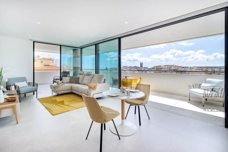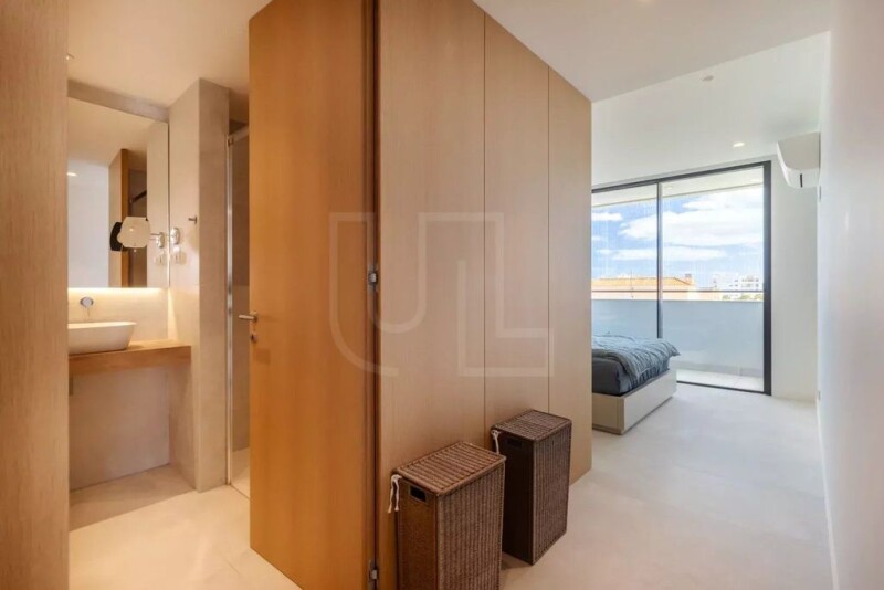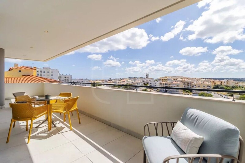 Stunning modern apartment located in Lagos with distant sea views. The 5th floor corner apartment is set on the top floor of a newly built block. It comprises an entrance hall with fitted storage cabinet, a bright open plan living area with a fully equipped kitchen and dining area, 2 bedrooms, 2 bathrooms and a large south west facing balcony boasting sun all day. Both bedrooms feature fitted wardrobes and share a south facing balcony. Other features include air conditioning, underfloor heating, electric window blinds, high speed internet, solar panels and central vacuum system as well as an allocated parking space in the basement garage. Communal facilities include swimming pool, children's pool, sauna and gym. This home is good rental investment, permanent residence or holiday home!.