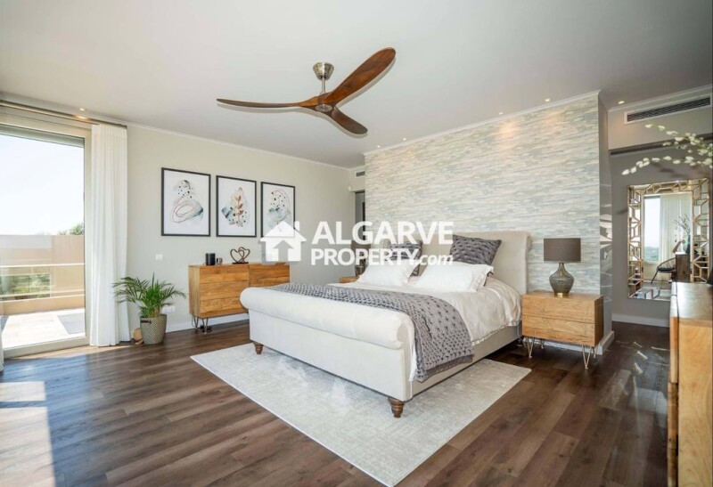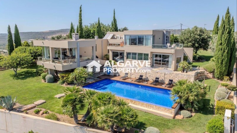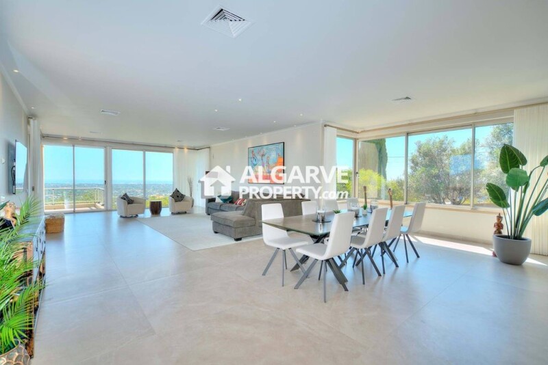 Luxurious "one of a kind" 4-bedroom villa boasting unique panoramic views of the central Algarve's coastline and countryside, just a 10-minute drive from Vilamoura and the beach. This contemporary villa features luxury finishes throughout. Situated on a 2,559 sq.m plot with 488 sq.m of built area, the villa offers a spacious lounge and dining area with breathtaking views, a large fully equipped kitchen, and 4 en-suite bedrooms with fitted wardrobes, dressing rooms, and expansive terraces. One of the bedroom terraces includes a Jacuzzi tub for ultimate relaxation. Multiple terraces provide excellent sun exposure and stunning panoramic views. The open basement offers versatile space for a games room, dining area, and more. Equipped with air conditioning, underfloor heating, a central vacuum system, and an alarm system, the villa ensures comfort and security. The private garden features a heated swimming pool. Borehole. The property also features two large car ports, offering shaded car parking for several vehicles. A fantastic investment opportunity and a must be seen to be fully appreciated!.