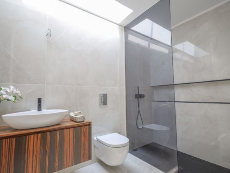 The residence conveys an indescribable sense of well-being and comfort. All the bedrooms have en-suite bathrooms and built-in wardrobes, and the house's shutters are electric, just like the thermal break window frames. The spacious living room is exceptionally bright, and there is a self-sustaining garden inside the house. The living room, kitchen, and bedrooms all face the garden and pool, offering a pleasant view through the large windows. Energy Rating: A.