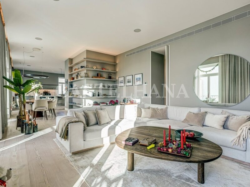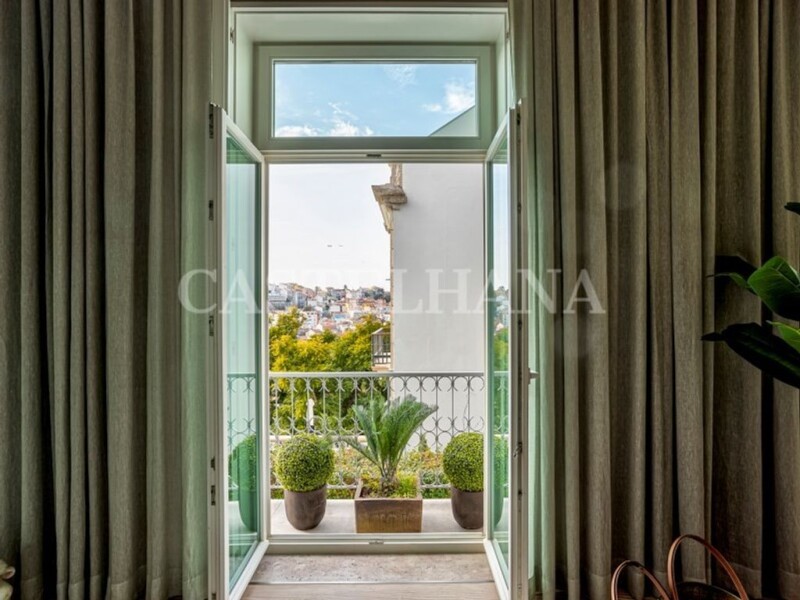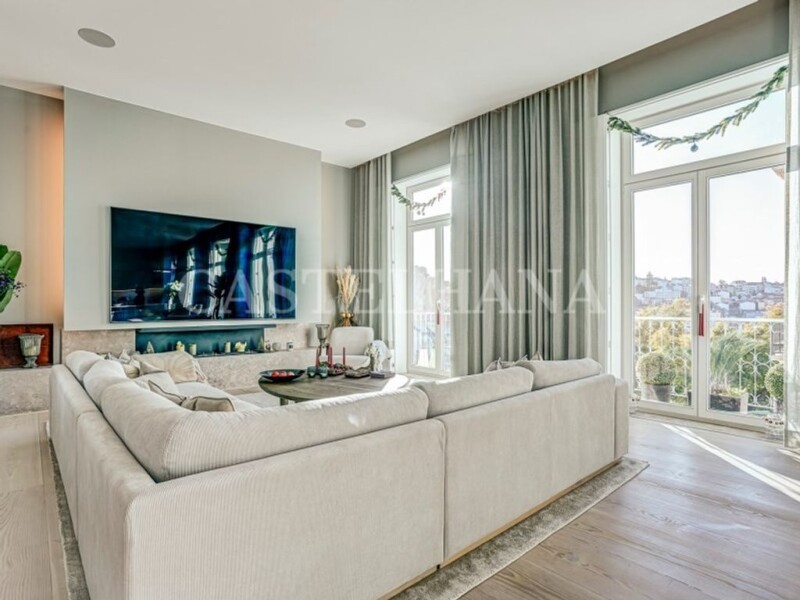 4 bedroom flat, with 2 parking spaces and views, located in Campo Martires da Patria. Two buildings and a palace from the early twentieth century gave rise to the Torel Palace Residences, where the flat is located, and the Torel Palace Hotel, at the top of Santana Hill, overlooking the city of Lisbon, next to the Torel Garden, close to Avenida da Liberdade and downtown Lisbon. With a gross private area of 196 m2 and gross dependent area of 30 m2, sober and sophisticated design, with direct and private lift access and a ceiling height of 3.30 m, this flat has been designed with constant care to offer its occupants the highest level of comfort and maximise space. The social area of the house, with the open-plan kitchen, with heating under the floor of Lioz, is directly connected to the dining area and living room, with 80 m2, this area has Danish Dinesen wood flooring, Sonos music system, false ceiling to hide the curtain connection, fireplace and a Phillips Hue system that controls the intensity and colour of light. The air conditioning and heating system is integrated into the walls, making the air conditioning of the spaces more discreet and elegant. The dining area is accompanied by an integrated bookcase, with indirect LED lights. From the living room we contemplate the view of the city of Lisbon framed through the shutters that open onto a balcony that accompanies this entire area. The appliances in the kitchen are from Whirlpool Professional and consist of an induction hob with fan integrated into the kitchen island. On the side wall, built-in, are a side-by-side refrigerator and freezer, built-in coffee machine and multifunctional oven. The dishwasher and wine cooler for 36 bottles are integrated into the long Korian worktop. The laundry room is hidden behind a door in the kitchen wall and is equipped with a washing machine and dryer. The flat is divided into two private areas, on opposite sides of the social area, each with two bedrooms. On one side is the master suite and a second bedroom/office with a support bathroom. On the other side we have two bedrooms, full bathroom and guest bathroom. The building respects the existing architectural reading, offers the quality and privacy of a premium development, as well as access to the hotel's services that the owner can benefit from, such as concierge service, heated pool, spa, gym, bar and terrace overlooking the city, and the Michelin-starred restaurant, 2Monkeys. Don't miss this opportunity! For over 25 years Castelhana has been a renowned name in the Portuguese real estate sector. As a company of Dils group, we specialize in advising businesses, organizations and (institutional) investors in buying, selling, renting, letting and development of residential properties. Founded in 1999, Castelhana has built one of the largest and most solid real estate portfolios in Portugal over the years, with over 600 renovation and new construction projects. In Lisbon, we are based in Chiado, one of the most emblematic and traditional areas of the capital. In Porto, in Foz do Douro, one of the noblest places in the city and in the Algarve next to the renowned Vilamoura Marina. We are waiting for you. We have a team available to give you the best support in your next real estate investment. Contact us! Energy Rating: B.