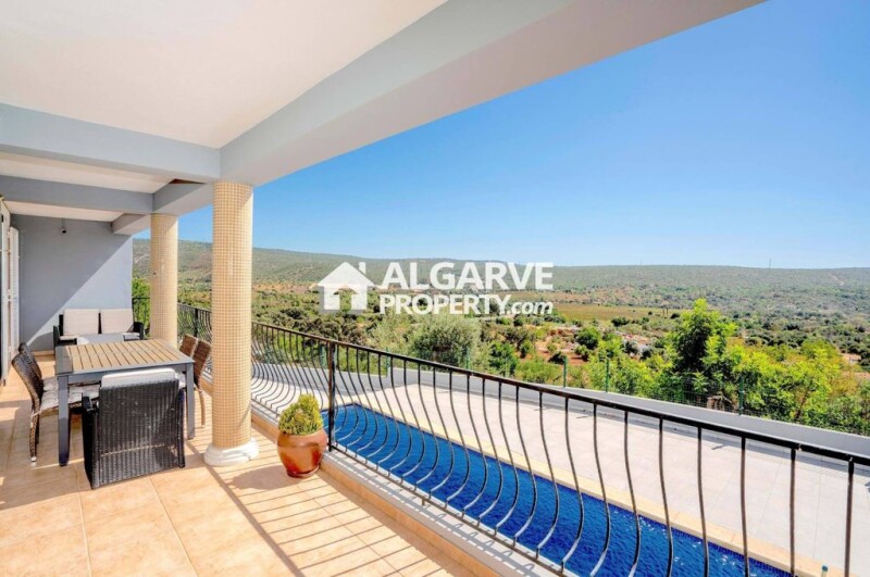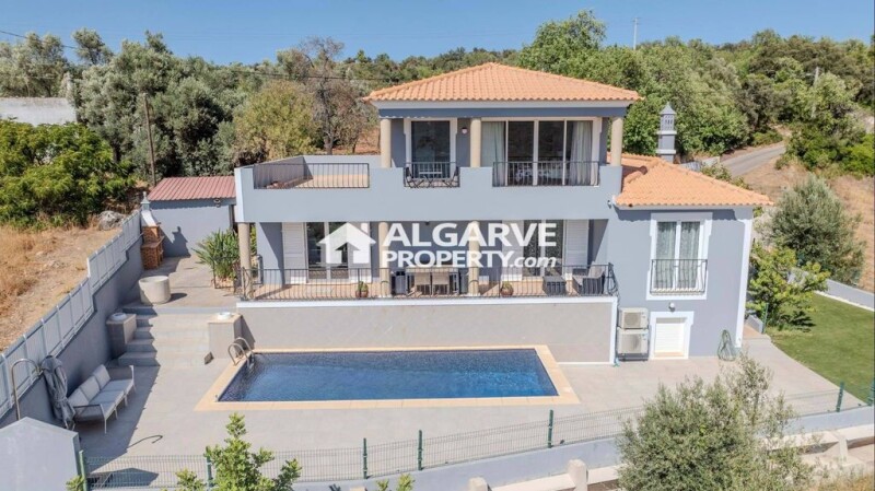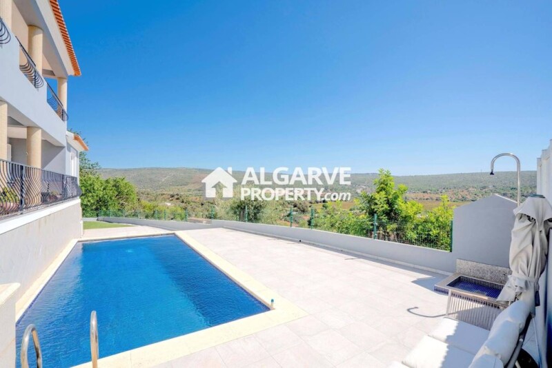 Discover this magnificent modern V2+1 villa, located just minutes from the center of Loulé, the village of Tôr, and the prestigious Ombria Algarve Golf Resort. Perched on a hill, this property offers fabulous panoramic views of the surrounding natural landscape, making it the perfect retreat for those seeking peace and privacy. The 956 Sq.m plot features a 245 Sq.m building area, thoughtfully designed to enjoy the breathtaking views and provide maximum comfort and convenience. On the ground floor, you will find a spacious and bright living room with a fireplace, a generously sized fully equipped kitchen, a bedroom with an en-suite bathroom, a small office ideal for work or storage, and a guest bathroom for added convenience. The first floor is dedicated to the master suite, a very well sized bedroom with an en-suite bathroom and direct access to a terrace that invites you to relax and enjoy magnificent countryside views. The spacious terraces surrounding the villa benefit from excellent sun exposure throughout the day, perfect for outdoor relaxation. The villa is equipped with air conditioning, double-glazed windows, and offers covered parking for one car. The private garden, complete with a stunning pool, adds the finishing touch to this dream property. Full of character and style, this villa is the ideal investment for those who value the tranquillity of the countryside. Don't miss the opportunity to acquire your perfect retreat in the heart of the Algarve! AlgarveProperty.com - AMI 2496 - T.:00351 289310310.