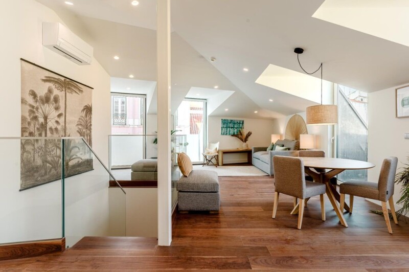 The Gloria 70 project, located between the bustling Avenida da Liberdade and the charming Praça da Alegria, represents a complete transformation of a historic building. The careful preservation of the original architecture is seamlessly blended with modernization to fulfill contemporary requirements while preserving the city's cultural heritage. This tourist apartment has been designed to integrate all the comforts, quality, and technological innovation valued in modern life into the structure. While maintaining a focus on authenticity and comfort, a committed team of architects and engineers diligently sought technical solutions to safeguard the unique traits of each component of this valuable historical heritage. Living in the Gloria 70 building means enjoying a central location, surrounded by all the amenities, and at the same time living in a unique environment designed to offer elegance and well-being. Located on the 3rd and 4th floors of the Gloria 70 development, this two-bedroom duplex apartment, covering 147.55 square meters of private space, presents a living room, kitchen, three bathrooms, two suites, and balconies. Moreover, the property encompasses a sizable storage room, a communal lounge, gym, sauna, and shared changing rooms. Located in the beating heart of Lisbon, Avenida da Liberdade epitomizes the city's sophistication and style. Once home to Portugal's elite, it is now a center for business and entertainment, with luxury hotels, high-end shops, and exquisite restaurants. Inspired by the grand boulevards of Paris, its broad cobblestone streets exude a rich tapestry of history, while its majestic architecture seamlessly melds diverse styles, ranging from Gothic to contemporary. Offering effortless access to the city's core districts and the Cascais line, Avenida da Liberdade provides a convenient link to Lisbon Airport, a mere 20-minute journey away.