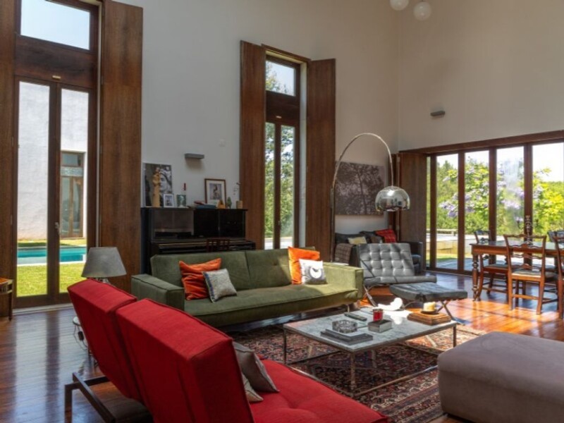 Luxury villa designed in detail with contemporary lines of high quality construction, with almost 700 sqm of living area spread over 3 floors where the projection of natural light was designed to beautify its architectural set and enhancing a perfect symbiosis between space interior and the garden where you can enjoy the fantastic private pool. On the main floor we find the social area consisting of emblematic living and dining rooms, kitchen and the private area spread over 1 suite and 2 bedrooms. The first floor was designed as a work area with an office, a large library and a lounge with a fireplace where we can find a peaceful place to work, study or just play, surrounded by a bucolic view of the outside garden. For a better comfort of its owners we find at the basement level a large garage with direct access to the interior of the house. In its exterior space of 9200 sqm, the property also has a borehole, a kennel, an orchard and an annex with 100 sqm of contemporary lines built in solid cedar from Brazil that includes two bedrooms, bathroom, kitchenette and a living room. Ideal for a good welcome to friends or family. The entire contemporary set of this property allows you to combine the urban and the rustic in a unique place for your next residence! Energy Rating: B-.