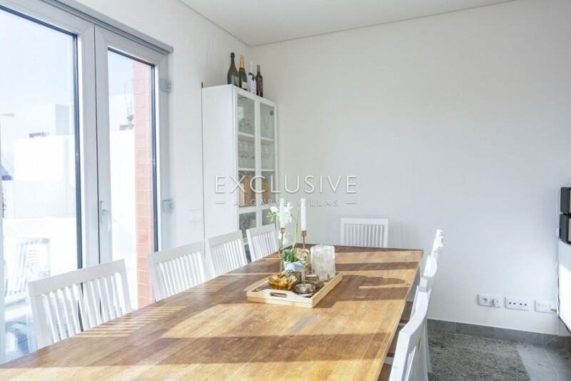Stunning contemporary architect-designed townhouse made for indoor outdoor living, located in a prestigious and quiet, yet central area of Vilamoura near golf, beach, marina and international school. Finished in July 2021 with top quality materials and thermal insulation, solar treatment glass, electric shutters and other features. The property totals 245 sq.m. and has fantastic terraces, three en-suite bedrooms with built-in wardrobes, a modern and large open plan livig room with gray stone floors throughout, a sleek kitchen with handleless cabinets and built in appliances, modern bathrooms with electric towel racks and custom made cabinetry. The master bedroom has access to own large balcony/terrace. One of the other bedrooms has access to the private jacuzzi area. The villa has storage and laundry facilities (two washers and a dryer), heated by solar power. The property comes fully furnished in Nordic design, fully equipped kitchen and all outdoor furniture and an outdoor 5 person jacuzzi. The condominium has a south facing Junior Olympic size swimming pool (heated), Landscaped gardens with fruit trees (orange/lemon/fig/pepper/olive) automatic irrigation system and high security system and fitness center. The villa also has a private sauna, large roof deck with sea view, smart air conditioning/heating installed throughout suspended fireplace, outdoor storage, laundry room, underground parking for 2 cars, electric garage door, solar system.