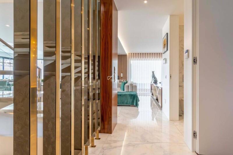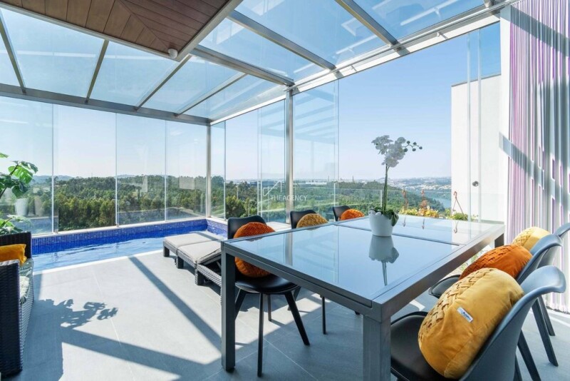 Luxury 4-front villa of type T5 with 5 suites and service room, with a construction area of 387.5 m2 and a 300m2 garden and heated swimming pool with East/South/West orientation and protected to the North, which can be open or completely closed by huge doors and a completely removable glass roof with magnificent views over the Douro River. Modern architecture with simple and direct geometric lines and high standards of comfort, with a heating system, underfloor heating, marble on the ground floor and wood on the 1st floor and air conditioning in all rooms. This luxurious new mansion, built in 2023, is spread over 3 floors with strategic points of external finishing in lead gray phenolic, fully furnished and equipped with a covered balcony around the entire house with double protective glass on the second and third floor, with stunning view of the Douro River. Located in Quinta de Poiares, an exclusive condominium of villas in the parish of Olival, next to the FCP Training Center and with magnificent views over the Douro River, this villa, practically new and less than 1 year of use, gives unique luxury features, modernity and privacy, of which we can highlight: Large private floor area of 343 m2 with 6 bedrooms, 5 of which are suites, and a room that could be used as an office. All bathrooms with sinks carved in natural stone, and natural stone floors with storage and furniture designed and designed with high standards of luxury, in which all suites have views of the Douro River. Custom-made curtain from luxury materials The property has 2 integrated living rooms and a dining room integrated with the American open concept kitchen. Marble flooring, with electric underfloor heating, and the entire staircase in the house also has marble flooring. A large washing machine with storage designed with wardrobes. In the basement we have granite flooring and high-luxury furniture for games, wine, etc. Central vacuum throughout the house Ambient sound in all rooms Security system with alarm and CCTV. Blinds/light/air conditioning home automation system Covered pool area with stunning views of the Douro River, heated with a heat pump and with a covered barbecue area, complete and air-conditioned, American fridge, cupboards, room integrated into the house, and can be used all year round with glass cover and with an air-conditioned environment, air conditioning and heating DHW system (solar/heat pump/gas boiler) “guaranteed hot water” Minimalist German frames double glazing with thermal and acoustic insulation Bathrooms with stone floors and countertops (quartz, granite) and electric underfloor heating Dining room lamp made by renowned artist (Eliza Bravim), all in Swarovski crystals Service bathroom lamp made by artist (Eliza Bravim), gold plated with crystals Swarovski. Environments with custom-made furniture planned, designed and manufactured by the company JDias. Automated irrigation using its own hertzian hole. Photovoltaic energy system Large outdoor garden area all in grass with shower to support the pool Garage for 3 vehicles Technical area was built outside the house to avoid any internal noise inside the house, in addition to making it possible to store maintenance items, tools, etc. This property is for sale fully equipped and furnished, with only a few items not included in the sale of the house, such as the lamp installed on the stairs at the foot of the house and two paintings by artists that hang on two walls in the hallway of the area. intimate with the family, a wall piece that sits on the golden dining table.