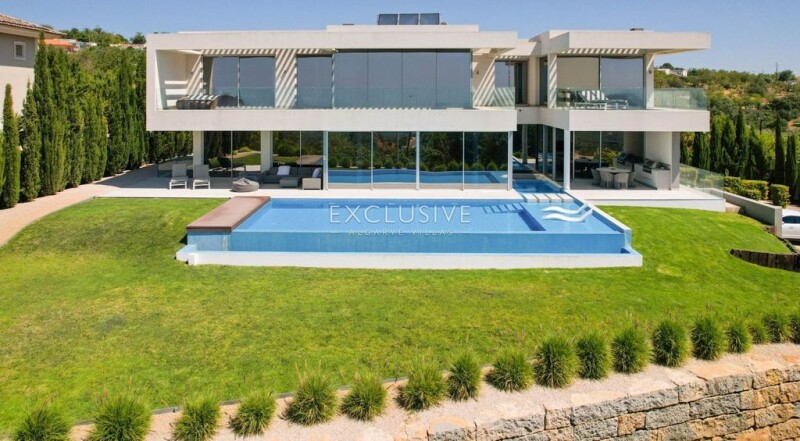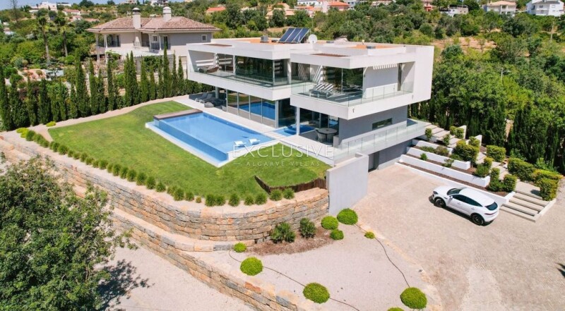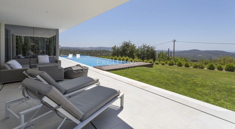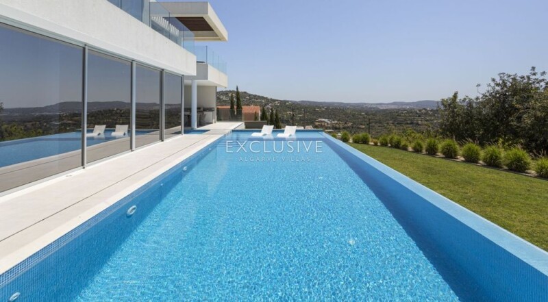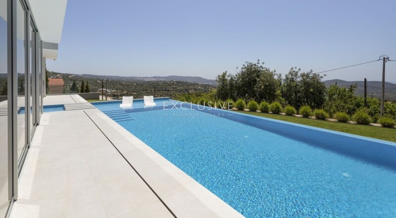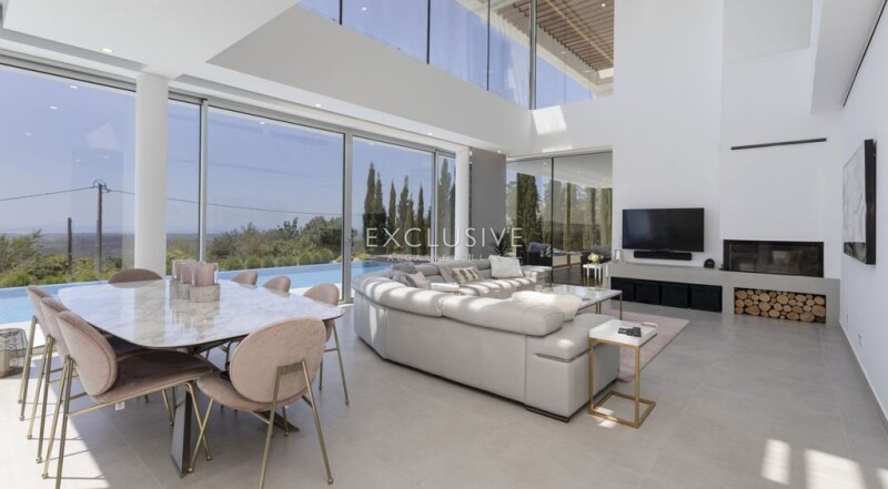 This contemporary villa is located on an elevated position in the area of Sr. Sebastiao, Loulé near a small village. The property boasts breathtaking coastal views from all areas of the house. From the entrance, you are welcomed with a high ceiling hall, and suspended staircase and plenty of high windows to allow you to view the uncomparable seaviews. The Living room and dining area are combined and have oversized windows to the ceiling and access to the terrace and swimming pool area. The contemporary kitchen is fully equipped with an american fridge with ice maker, oven, plate warmer, microwave, dishwashwer, built-in water boiler, wine fridge, and centre island with hob and exhaust. The kitchen extends to the exterior with sliding doors to the bbq and outdoor dining area. On this level, therere are two en-suite bedrooms and a guest w/c. The elevator connects to the first floor and basement. The first floor has the master bedroom with dressing area and large shower room, a mezzanine area by the staircase, ideal for an office area, and an additional guest bedroom with en-suite bathroom. All bedrooms have built-in wardrobes. The basement is very large garage and equipment area, with natural light, to fit up to 6 vehicles. The property is fully fenced and landcaped, it has alarm system, video vigilance, solar panels, underfloor heating and central air conditioning and electric blackouts. The swimming pool has a cascade creating an infinity effect towards the ocean and there is an arquitectural water feature between the kitchen and living room to further enhance the swimming pool design and sun lounge areas. The property is within easy access to Loulé centre and all emenities, and only 15 minutes from the beaches of Vale do Lobo, and Vilamoura marina.