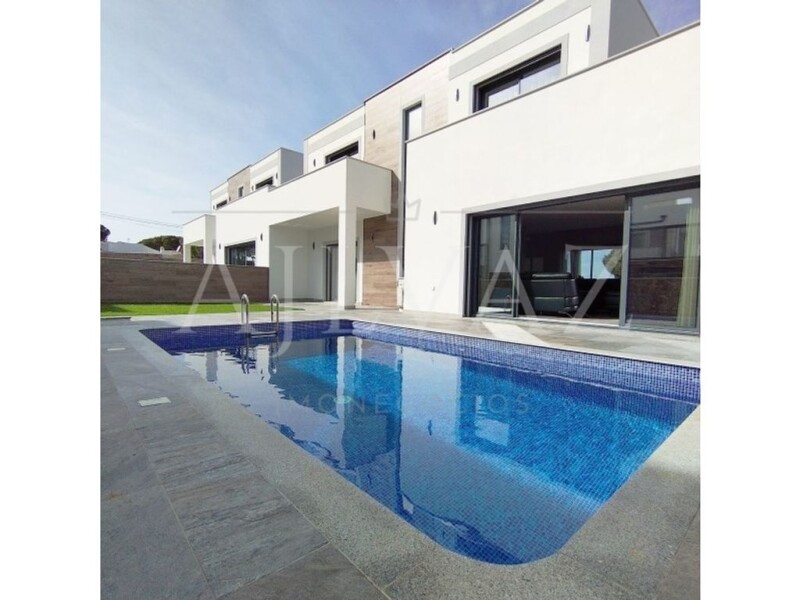 Semi-detached house with 3 bedrooms, new and modern style, with private garden and pool. Parking space. Ready to go, with just a few simple details to complete. Located in a very pleasant and calm area, just 6 minutes from the beach and 10 minutes from the center of Albufeira, where you will find all amenities, commercial establishments and services. Composition of the House: Ground floor: - Entrance hall. - Bedroom with built-in wardrobe and direct access to the outside. - Spacious bathroom with bathtub. - Open-plan kitchen and living room with generous sliding doors that provide access to the outside. - Machine room/storage/laundry under the stairwell. 1st Floor: - Hall with closet - 2 bedrooms with built-in wardrobes, en suite. The bathrooms have a shower base. - Both bedrooms have a balcony: one with 6.80m2 and the other with 19.90m2 (L-shaped) Exterior: - 21m2 swimming pool - Leisure area, with artificial grass To take into account: - Parking space outside. - The property is not located in a condominium. - The House is Equipped and Furnished - Bosch brand appliances - Roca Sanitary Ware - Split air conditioning Distances: - Belharucas Beach: 2.5km - Albufeira Center: 5.5km - Algarve Shopping Centre: 10km - Albufeira Marina: 8.3km - Faro Airport: 30km Energy Rating: A.