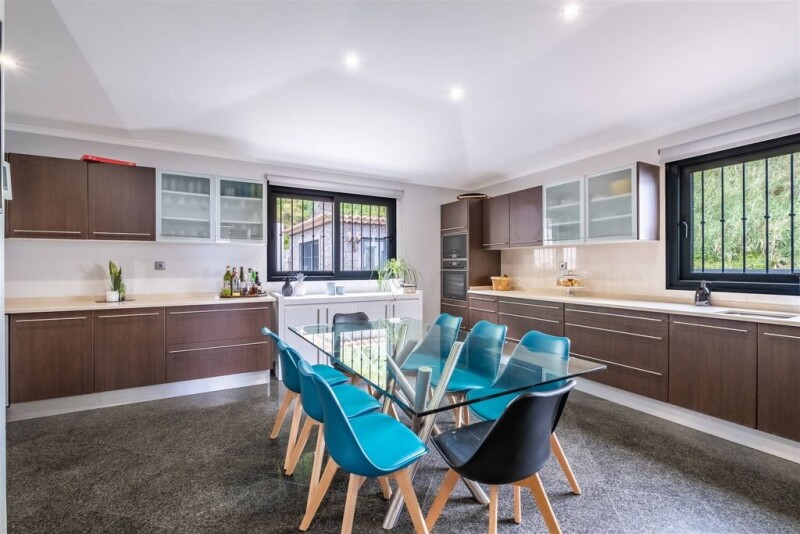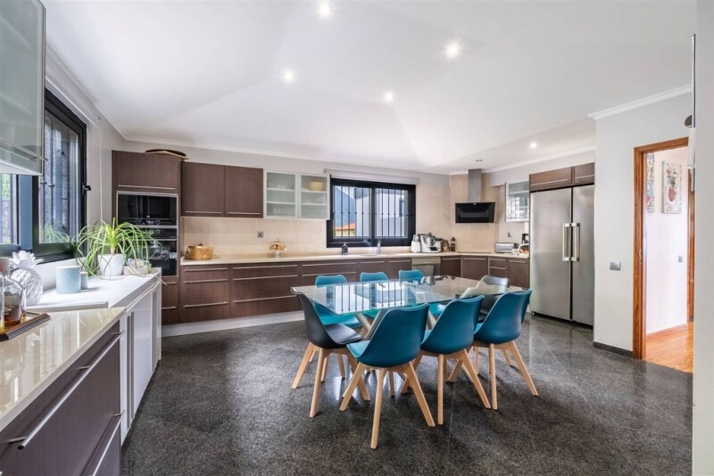 Fantastic traditional-style house located in a quiet and sunny area, very close to the town center and the beach. With panoramic views of the sea and mountains, this house spans three floors. The first floor comprises a garage with capacity for four cars, a storage room, an office, an extra bedroom with a complete bathroom, and a covered area with a barbecue and wine cellar. The second floor features a spacious fully-equipped kitchen with direct access to the garden, a dining room, a living room with a fireplace, a guest bathroom, and two bedrooms, both with full bathrooms. The third and top floor consists of a master suite with a walk-in closet and panoramic views of the sea. On this floor, there's also an area with gym equipment with direct access to the same balcony. Notably, the flooring is made of pitch pine wood, from social areas to bedrooms. Set on a plot of nearly 8,000 square meters, this property also includes a single-story contemporary-style house, comprising two en-suite bedrooms, an open-space kitchen with a dining and living room, and a guest bathroom. Outside, there's a covered dining area, barbecue, and a swimming pool (currently under construction) with panoramic sea views. The house boasts generous spaces, both interior and exterior, and vast landscaped areas providing an excellent outdoor recreational space.
