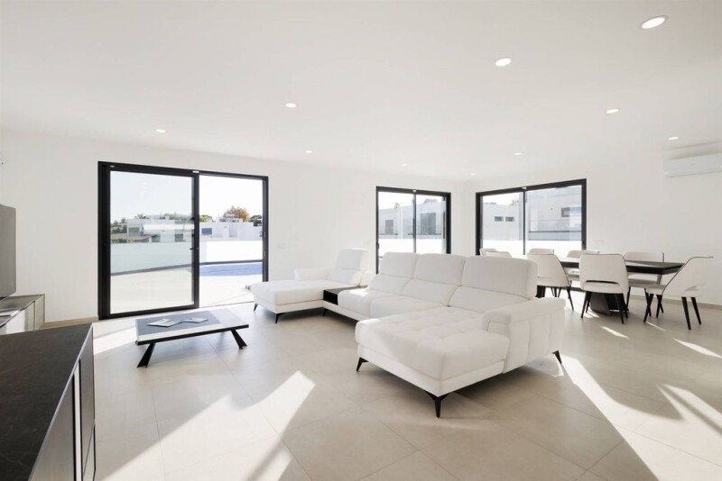 Modern architecture residence with luxury finishes, almost brand new, developed over three floors, set on a plot of around 900 square meters. When we enter the spacious and very elegant hallway in bright tones, we have, on the left, a storage room that can be used as a laundry. Also on the left, we find the first en-suite bedroom, which connects with the outdoor garden and pool area, as well as a guest bathroom. In front, there is a fully equipped kitchen with Electrolux appliances, adjacent to the huge living and dining area, surrounded by tall windows that provide abundant natural light. This room opens up to the outdoor area, with a separate barbecue and sink, as well as the pool (salt-treated), shower, and garden, perfect for relaxing moments with family or friends. On the first floor, there are two en-suite bedrooms and a huge south-facing terrace where you could place a pergola and a table for dining or sun loungers. On the second floor, there is another terrace of similar dimensions, perfect for installing a jacuzzi. Both terraces have water and electrical connections, so the possibilities are endless. The three bathrooms in the bedrooms feature walk-in showers. Going down to the basement, we find an area that occupies the entire house and could be developed into a cinema room, gym, or wine cellar, for example. The garage easily accommodates three cars and has electricity, water, and sewage connections, with an automatic gate. There is a washing and drying machine in the hallway adjacent to the garage. This sophisticated house has luxury finishes such as double-glazed windows, electric shutters, air conditioning in all rooms, thermal and acoustic insulation, underfloor heating, solar panels, and minimalist and elegant Italian furniture. The various floors are connected by a white marble staircase with tall windows, resulting in a perfect symbiosis between architecture and light. Located in a very quiet residential area, it offers enormous proximity (about three minutes by car) to Armação de Pera and its beaches, around ten minutes' walk to Praia Grande and Salgados, with its nature reserve traversed by wooden walkways along kilometers of coastline, perfect for walking, bird watching, or cycling. It is also close to access to the highway and A22, right in the heart of the Algarve, and about 30 minutes by car from Faro Airport.