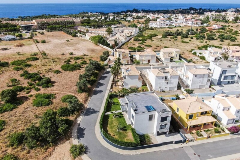 Welcome to this stunning and modern villa, nestled in a small, tranquil, and picturesque urbanization near the vibrant city of Albufeira in the Algarve region. Built just two years ago, this luxurious residence showcases contemporary elegance and offers an experience of an unparalleled lifestyle. As you approach the property, you'll be greeted by its sleek exterior design, characterized by clean lines, balconies, and expansive windows that allow plenty of natural light into the living spaces. Situated on an elevated plot, the villa offers beautiful views of the surrounding landscape. Spanning across three floors, this spacious villa comprises five bedrooms, four of them en suite, each with a private balcony. One bedroom is conveniently located on the ground floor, ideal for guests or as a master suite, while the other four bedrooms are situated on the second floor, ensuring privacy and tranquility. On the ground floor, you'll find a contemporary open kitchen equipped with state-of-the-art appliances and ample storage space. Adjacent to the kitchen, there's a living area, and for more formal gatherings, a separate dining room offers an elegant ambiance with large windows framing views of the lush surroundings. Across is a social bathroom. Ascend to the rooftop terrace and admire the breathtaking views of the surrounding green area with the city of Albufeira and the Atlantic Ocean. This expansive space is prepared to host a jacuzzi. It will be the perfect spot to relax and enjoy the sunset. Another highlight of this property is its outdoor space. The lovely garden with old olive trees, a generously sized swimming pool, and the large terrace are designed for relaxation and entertainment. Parking will never be an issue with the option of underground parking and others. Additionally, the villa features central vacuum cleaning, air conditioning in all rooms, and solar panels for energy efficiency and sustainability. The prime location near Albufeira offers residents easy access to all amenities, including unspoiled beaches, world-class golf courses, vibrant nightlife and charming local shops and restaurants. Whether for a permanent residence or a luxurious holiday retreat, this modern villa offers contemporary living in one of Portugal's most sought-after destinations.